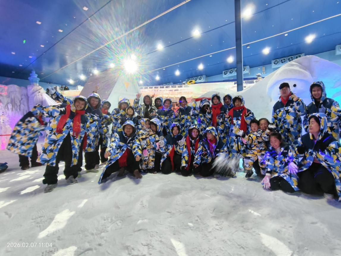 在戏雪区,听力残疾儿童小杰第一次见到冰雪世界。他站在一座透亮的冰屋前,踮起脚尖,小心翼翼地用手指碰了碰冰壁——凉丝丝、滑溜溜的触感让他睁大了眼睛。从好奇,到专注,再到藏不住的笑意,表情在他脸上悄悄流转。不远处,聋人陈春惜正高高举着手机,笑着拉住丈夫和孩子合影,定格下一家人在冰雪前的第一张全家福。“这是我们第一次在冰天雪地里拍合照,特别浪漫。”女儿郑延冰难言激动地说:“我要好好学习,长大带爸爸妈妈去北方看更大的冰雪世界。”