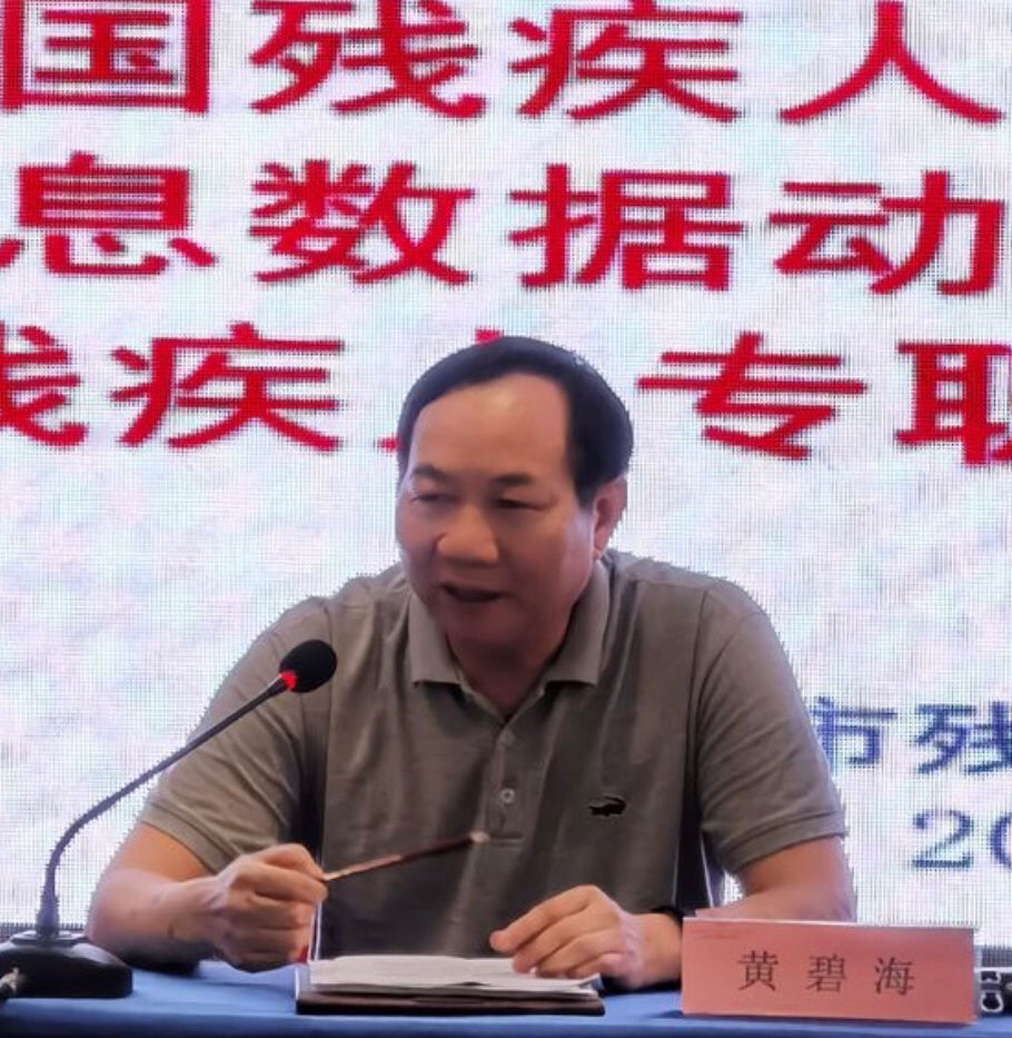 图为:海口市残联党组成员、副理事长黄碧海在培训班上作动员讲话