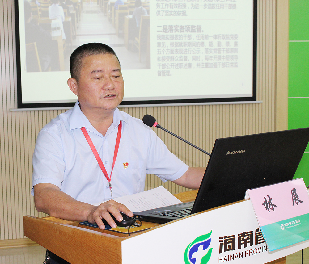 林展在选人用人工作专题报告中,对医院选人用人工作的基本情况进行讲解,从“建制度,提高工作规范;严标准,提高工作质量;勤考察,强化干部管理;强监督,科学教育管理;广开发,做好队伍建设;重保障,完善激励机制”等方面进行汇报,并指出存在的主要问题和改进措施。