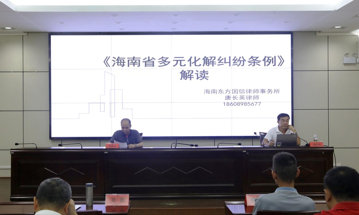 讲座特邀海南东方国信律师事务所资深律师唐长英担任主讲。重点解读了《海南省多元纠纷化解条例》制定背景与目的和主要内容,总结了自贸港特色创新亮点、介绍了各市县实施条例情况和实践创新举措,并探讨了《海南省多元纠纷化解条例》未来完善方向。