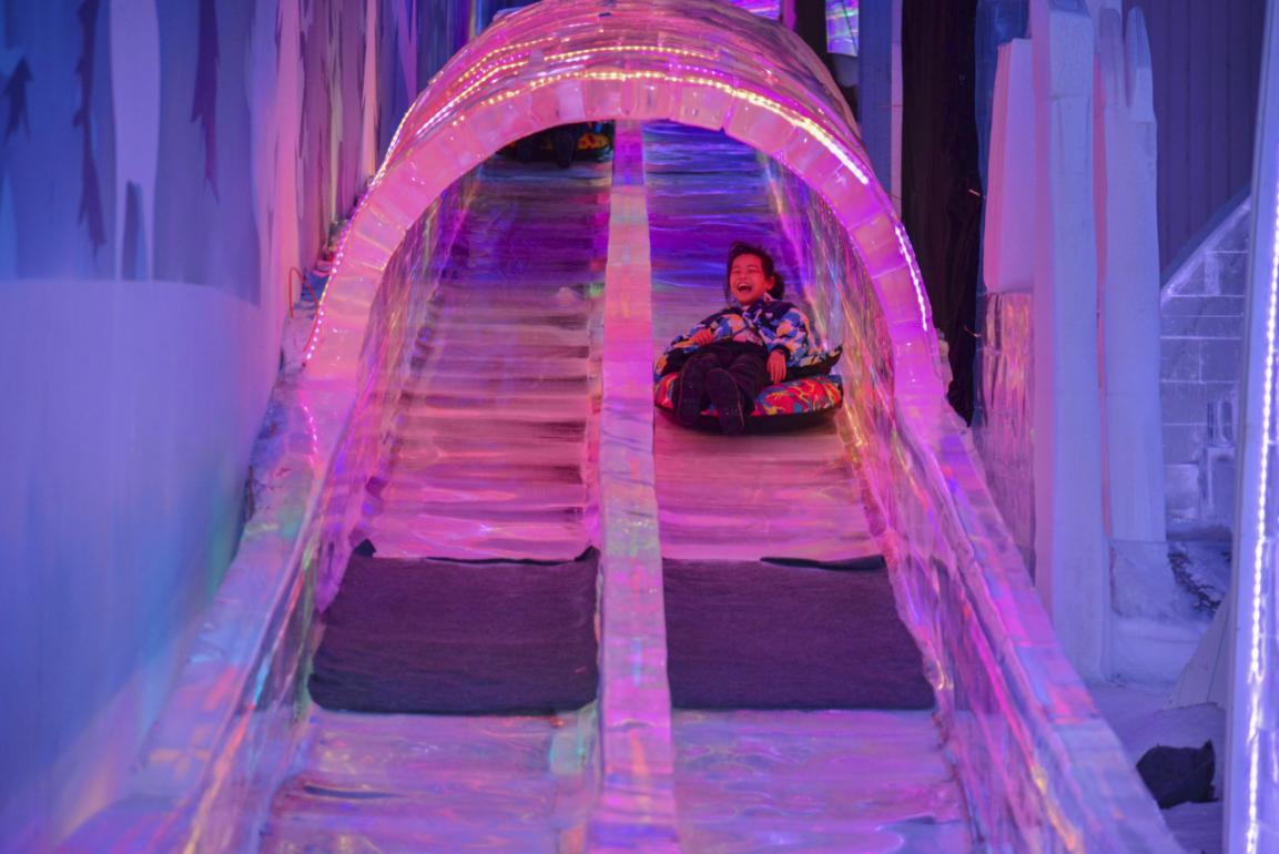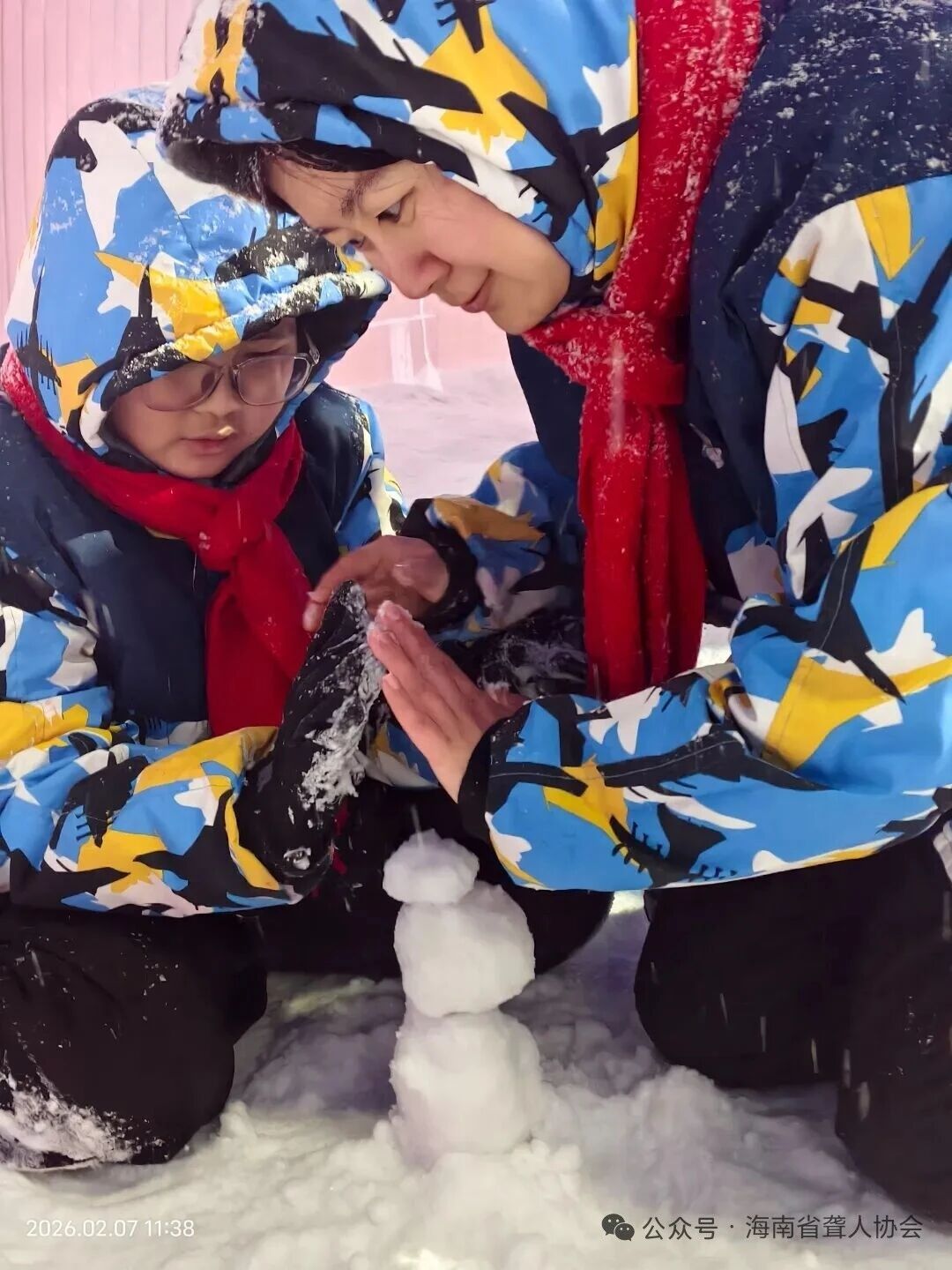 在戏雪区,听力残疾儿童小杰第一次见到冰雪世界。他站在一座透亮的冰屋前,踮起脚尖,小心翼翼地用手指碰了碰冰壁——凉丝丝、滑溜溜的触感让他睁大了眼睛。从好奇,到专注,再到藏不住的笑意,表情在他脸上悄悄流转。不远处,聋人陈春惜正高高举着手机,笑着拉住丈夫和孩子合影,定格下一家人在冰雪前的第一张全家福。“这是我们第一次在冰天雪地里拍合照,特别浪漫。”女儿郑延冰难言激动地说:“我要好好学习,长大带爸爸妈妈去北方看更大的冰雪世界。”